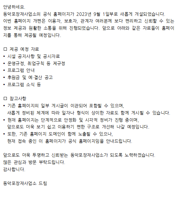 동악포장재사업소 홈페이지 리뉴얼 오픈 안내